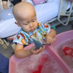Keeping him entertained is the challenging part. Occasionally, we’ll get help from the child life services here. Today, Jeremy had some story time in the morning and some water play in the early afternoon. Yesterday, I looped some string to a hook on the ceiling and tied a Spider-Man action figure (we borrowed from the playroom) to it. Here’s a video of him playing. He is such a joy.